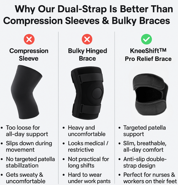 Most braces are bulky, slide down or feel cheap. KneeShift™ uses a smart dual-strap system engineered for movement: cleaner fit, better pressure distribution, and support exactly where you feel the pain.